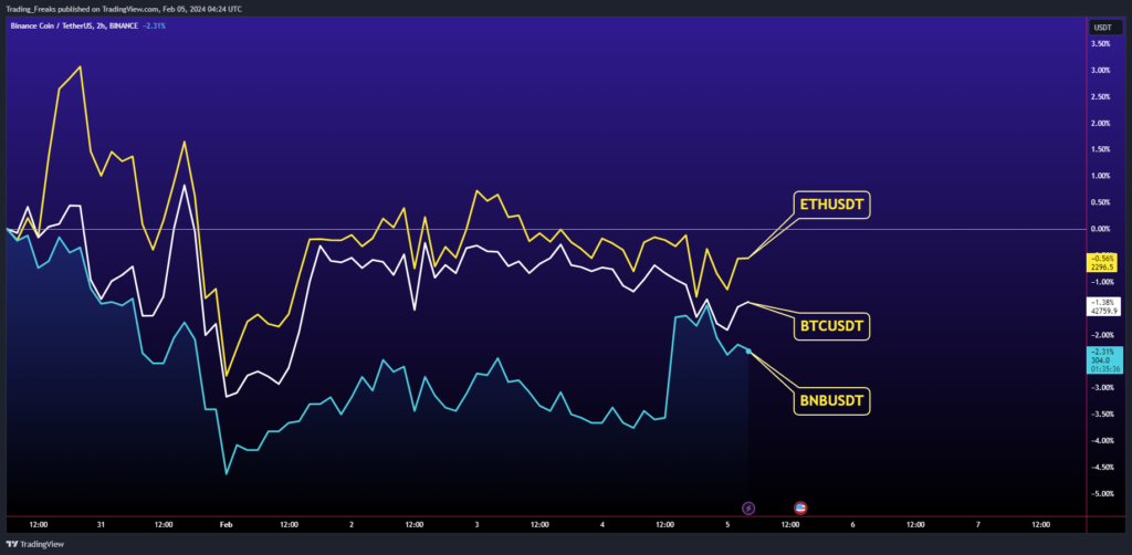 From the above chart, we can interpret that the price action of BNB is similar to that of BTC and ETH. That is, when the price of BTC and ETH increases or decreases, the price of BNB also increases or decreases respectively.