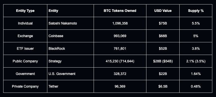 Top holders by category now include @coinbase, @BlackRock, @Strategy, the U.S. Government, and @tether, highlighting how Bitcoin ownership has shifted from individuals to exchanges, ETFs, corporates, and states, while the original stack remains untouched.