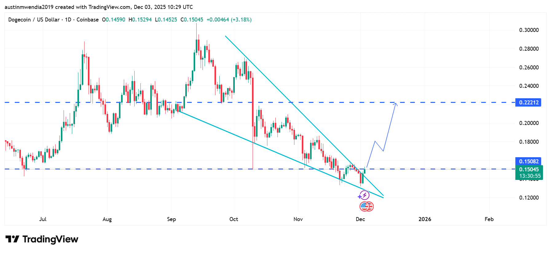 Dogecoin has responded favorably to the new filing and has experienced a good momentum in the market. The price increased by over 9% to $0.1494 within the last 24 hours. Dogecoin is trading above a falling wedge breakout on the daily chart, which can often indicate an increase in strength in the early trend reversal. The breakout formed near the $0.15 support zone, and buyers protected that level throughout the recent session. The daily chart also shows rising interest as volume expands during each move above intraday resistance levels.
