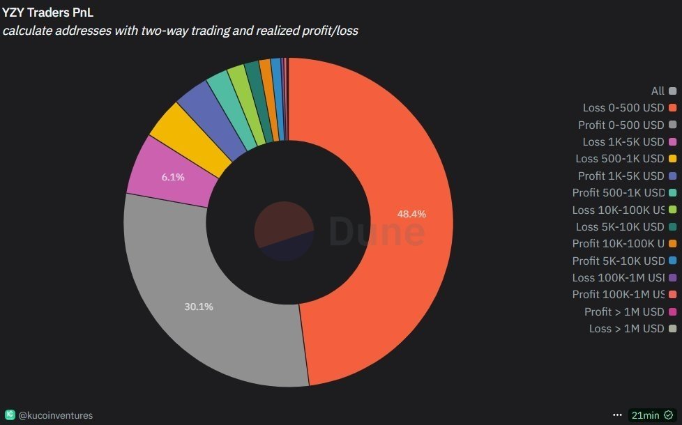 ICYMI: Over 60% of the 56,050 traders on Kanye West’s $YZY coin launched on Solana are in loss. • 523 lost $10K–$100K • 64 lost $100K–$1M • 11,759 (38%) booked profits.