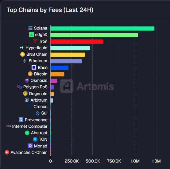 $1.12M in 24H fees puts @solana on top again. Not driven by congestion narratives, but by continuous execution at scale.@edgeX_exchange and @trondao round out the leaders where transactions are flowing, not waiting.