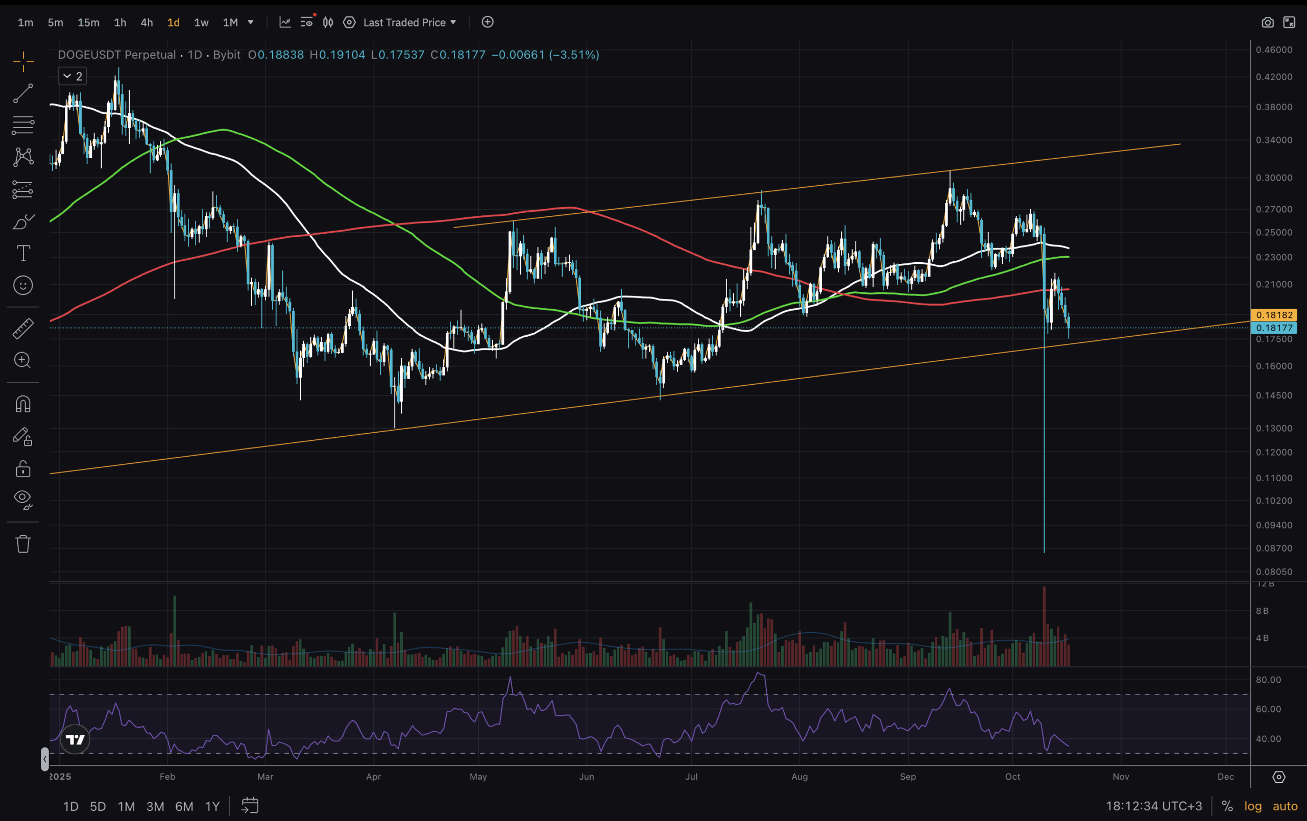 Let us begin today’s analysis with the Weekly timeframe. We have a few more days until the current weekly candle closes. What bulls want is for it to stay within the channel. But, next support can be found at MA200, or roughly at $0.14. If it does go that low, then we have a sideways support for all of 2025. Not impossible. A good sign is that RSI is around it’s mid-range and the Moving averages are in a bullish order – MA50 on top, MA100 in the middle and MA200 on the bottom.
