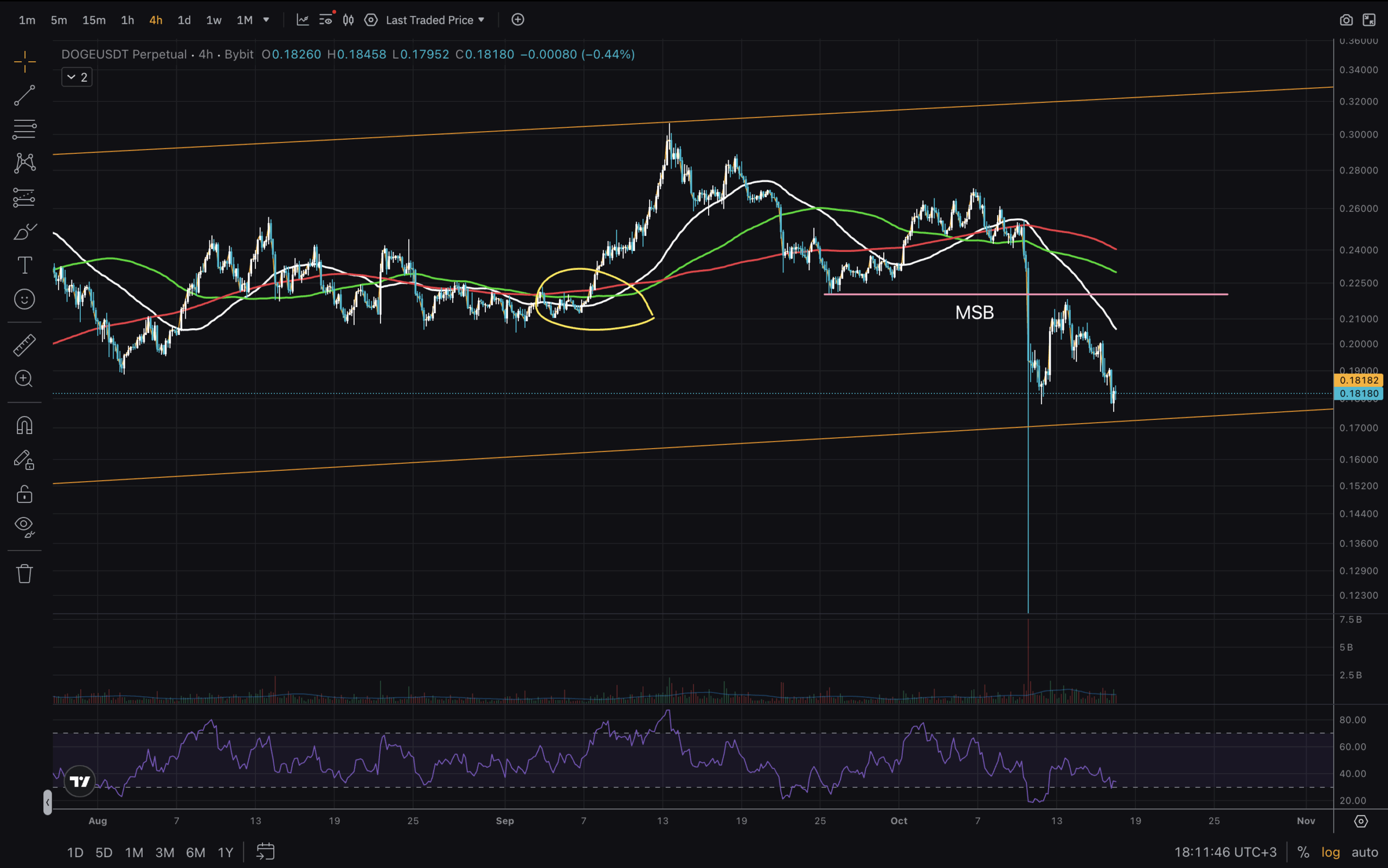 Final chart for the analysis is on 4H timeframe. In the previous article we discussed the possibility for a run above $0.30. But there was not enough fuel for that. Instead DOGE Price broke the precious low, essentially breaking the uptrend market structure. Of course, the massive liquidations are to blame for it. Nevertheless technical analysis does not ask questions or cast blame. It rather poses rules and neglects emotion. The rule now is – if we want a run higher, support needs to hold and MAs to be reclaimed. RSI here is at the bottom, suggesting a bounce at some point in the next days.