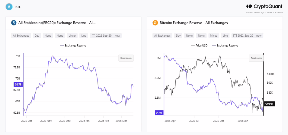 Stablecoin reserves provide a clearer picture of market liquidity, and recent data points to a slowdown. On March 18, stablecoin reserves stood at $68.8 million. Within 48 hours, that figure dropped to about $68.2 million, showing that investors pulled over $600,000 from the market.