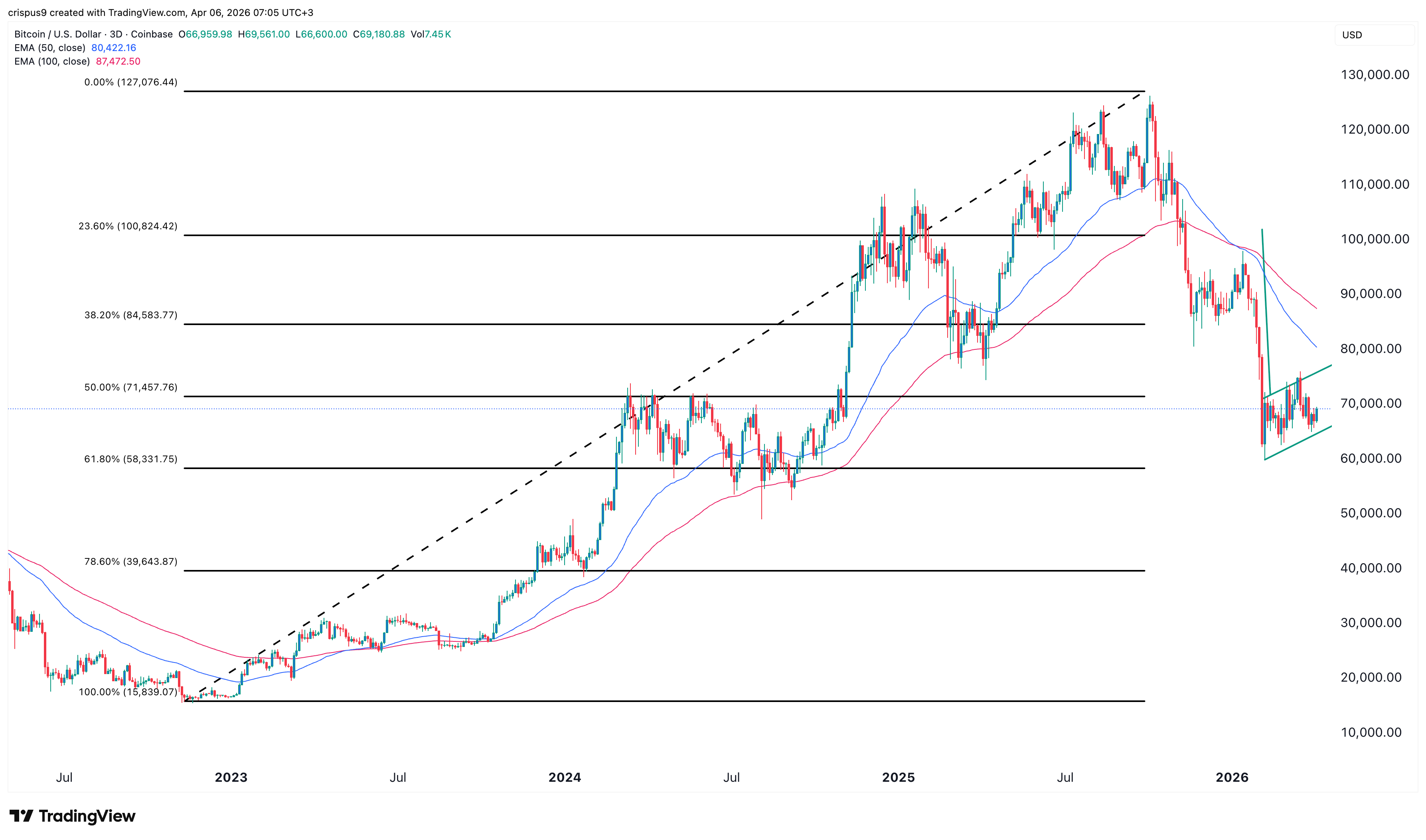 The three-day timeframe chart shows that Bitcoin price has pulled back in the past few weeks, rising from a low of $60,400 in February to the current $69,000.