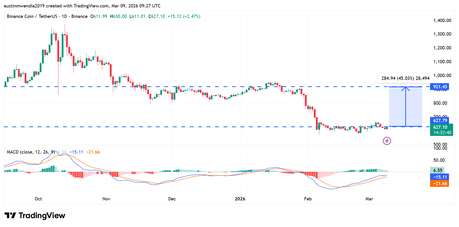 Meanwhile, the major resistance zone sits near $900 to $921. This level previously acted as support before the February breakdown. As a result, it now forms a strong supply area on the chart. A successful recovery could push the price toward this resistance region. In addition, the MACD is showing improving momentum as buyers continue building a base above the $620 support area. If strength continues, BNB could move toward the $921 resistance level.