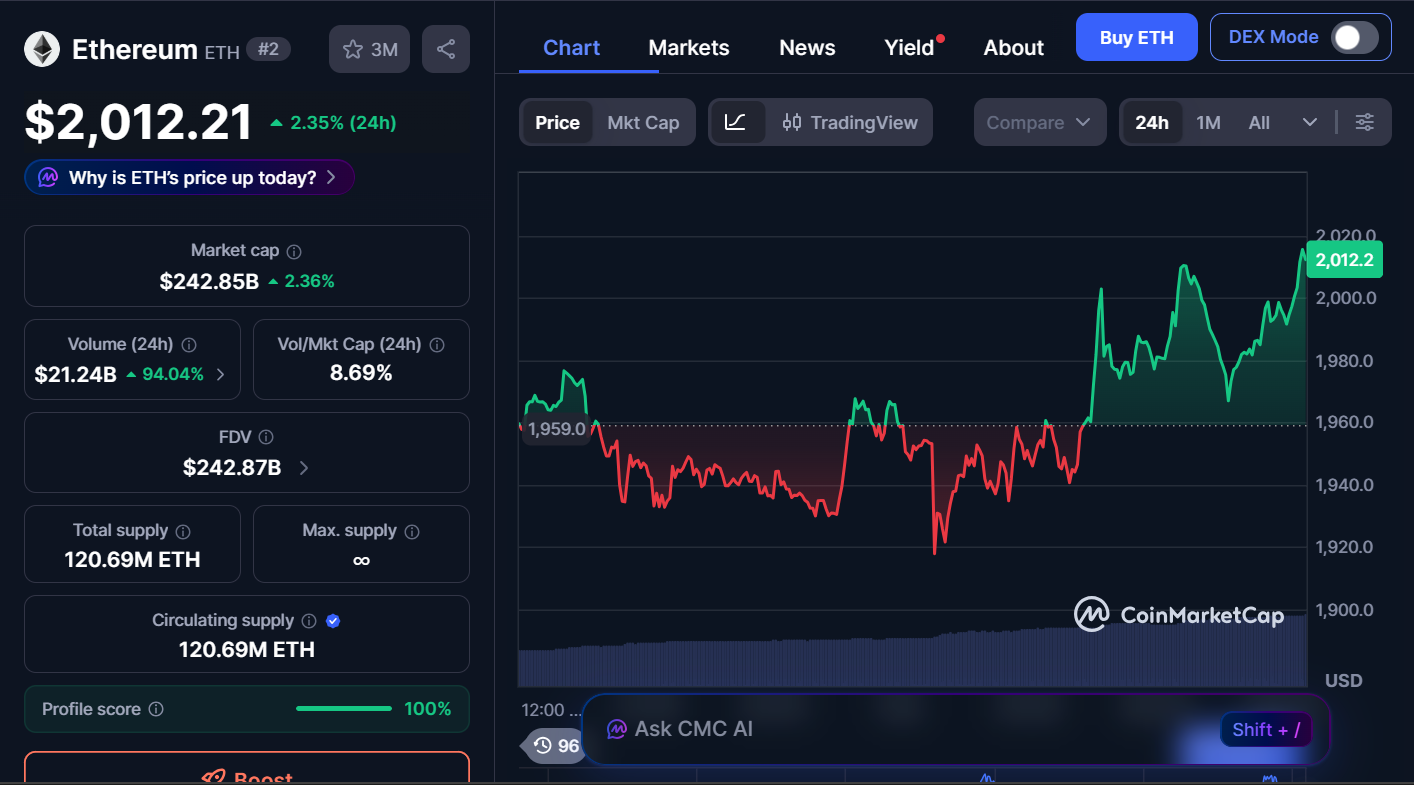 ETH is trading at $2,012, representing a 2.35% increase over the past 24 hours. The market cap stands at $242.85 billion, while the trading volume has increased by 94.04% to $21.24 billion.