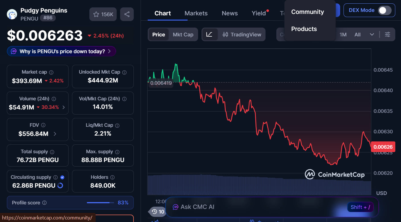 PENGU is trading at $0.006263, a 2.45% decrease over the last 24 hours. The market cap stands at $393.69 million. Meanwhile, the trading volume of the memecoin is down by 30.34% to $54.91 million.