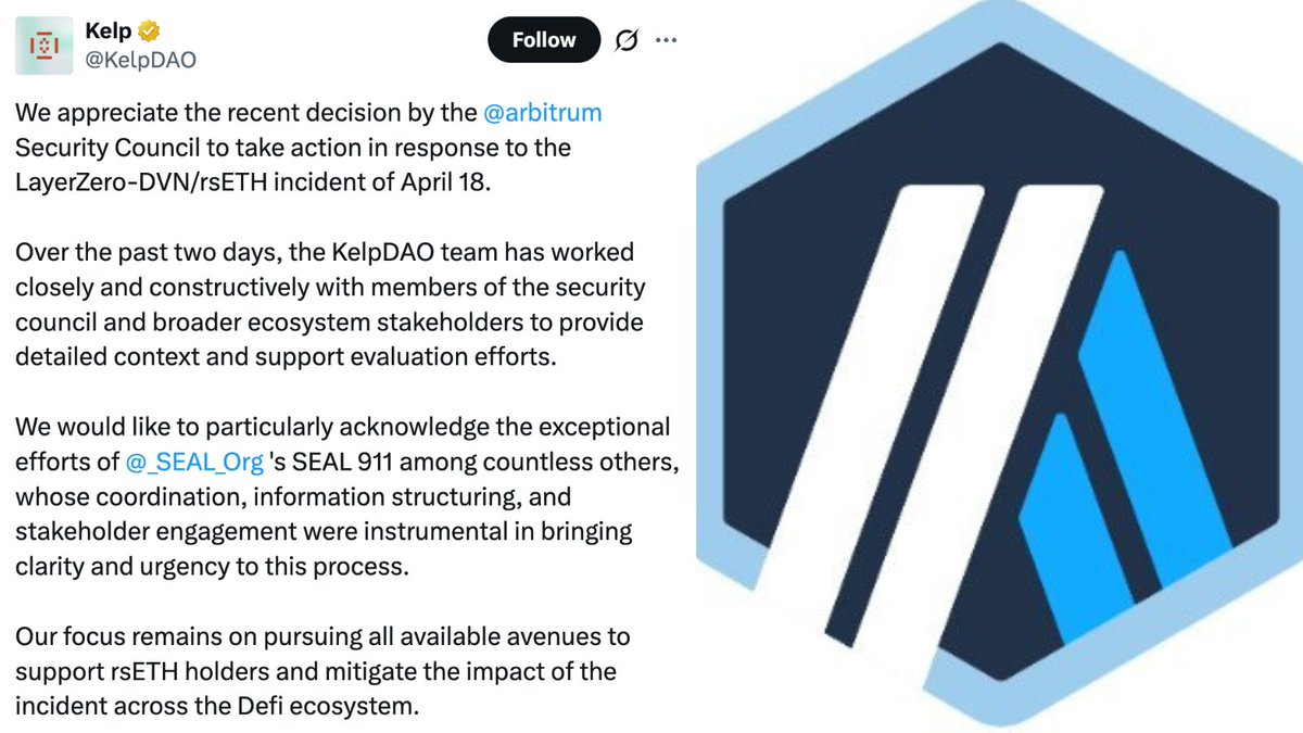 NEW: @KelpDAO PRAISES @arbitrum SECURITY COUNCIL FOR FREEZING OVER $71M WORTH OF $ETH BEING HELD IN THE ADDRESS ON ARBITRUM ONE THAT IS CONNECTED TO THE KELPDAO EXPLOIT pic.twitter.com/h8FhddZtcd