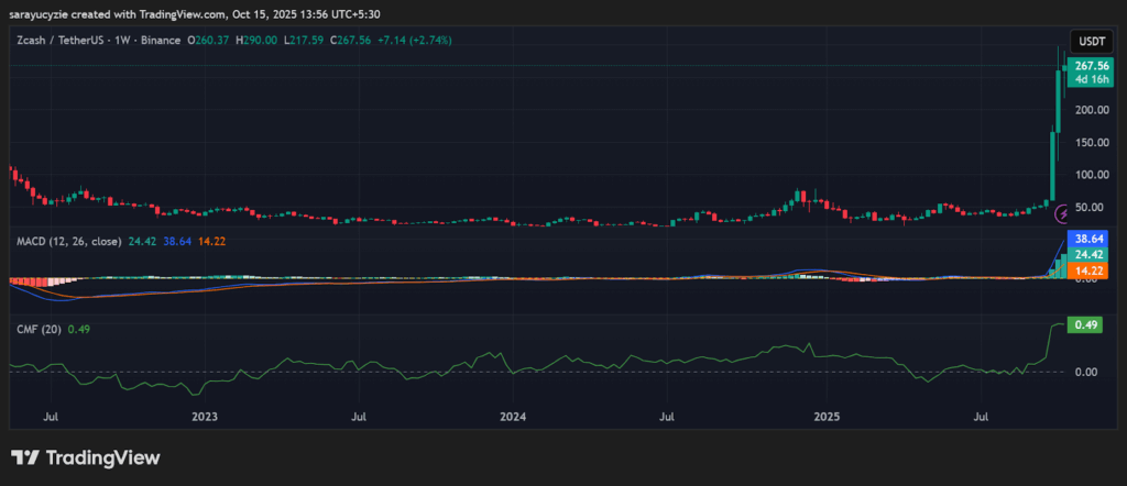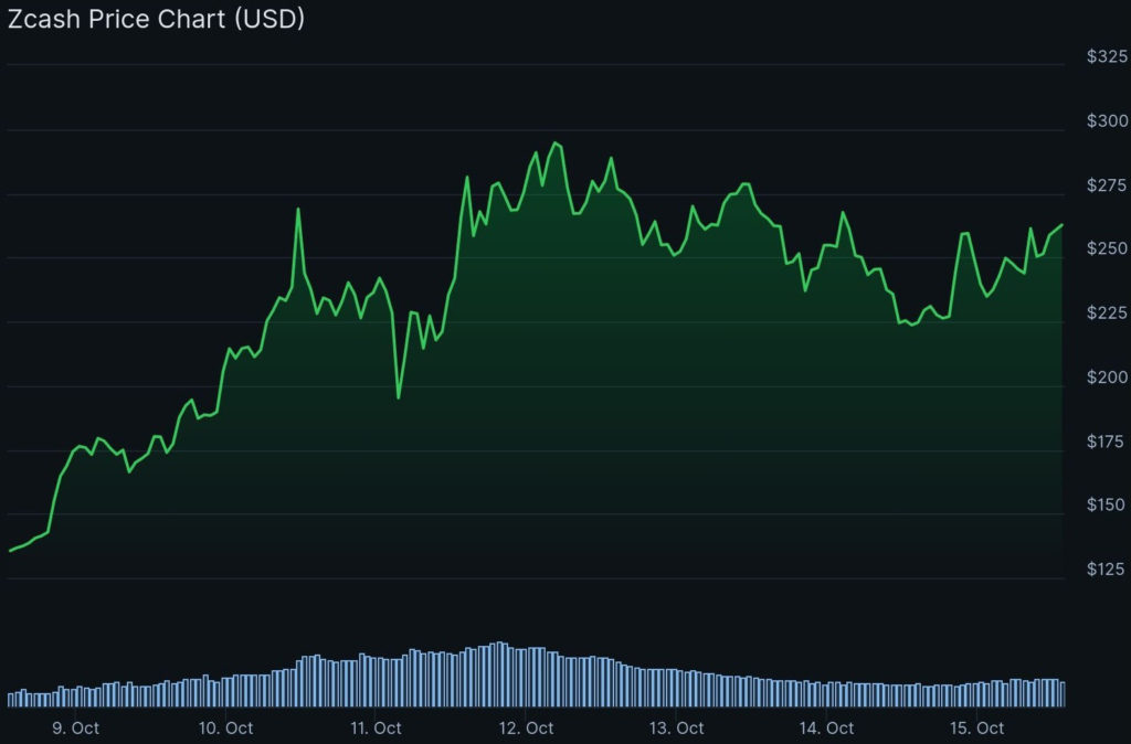 This move follows rising market activity and renewed investor interest. As of October 15, Zcash has jumped by over 17.80% and now sees it trades at $265.64. With a market cap of $4.35 billion, ZEC’s daily trading volume is up by over 33.97%, reaching $895 million. In the early hours, the asset traded at the bottom range of $222.11, and the bullish encounter sent the price toward a high of $272.55.