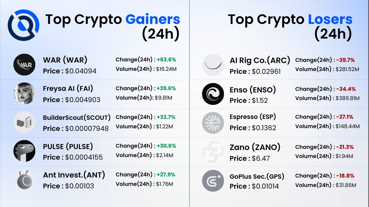 Crypto markets showed selective movement over the past 24 hours. Tokens such as WAR, @freysa_ai, @BuilderScout , PULSE, and Ant Investors recorded notable gains as short-term momentum rotated into smaller-cap and AI-related narratives. At the same time, selling pressure… pic.