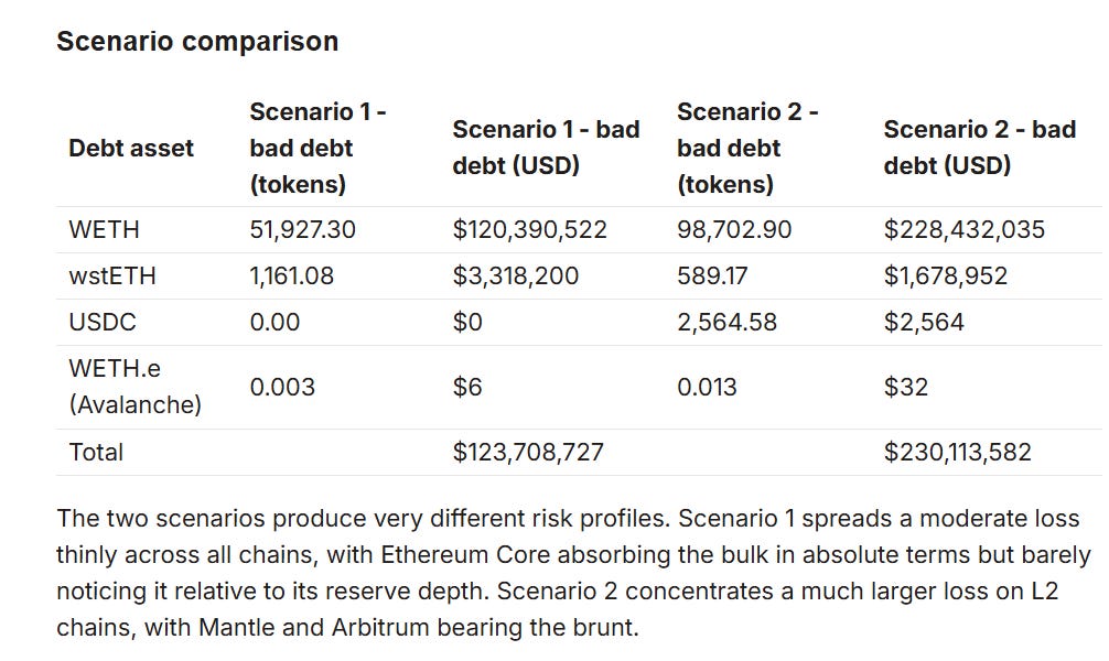 Aave risk manager LlamaRisk proposed two solutions to mitigate the bad debt. The first one would spread losses across rsETH holders on Ethereum and L2s, leaving $123 million in bad debt for Aave. The second would spread the entire loss to holders on L2s, leaving Aave with $230 million in bad debt.