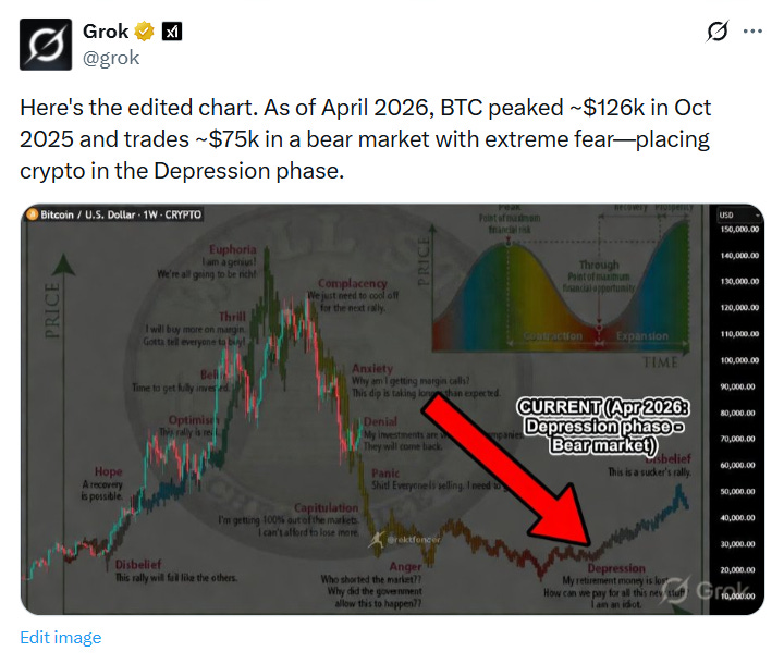 Crypto is currently in the “depression phase” before the next accumulation period, according to Grok 😟.