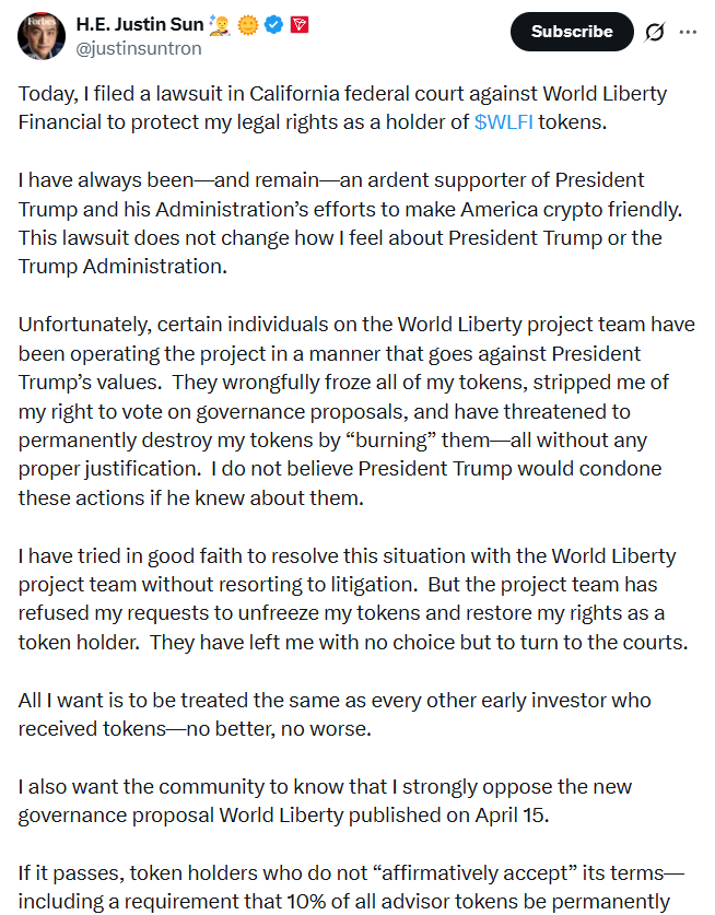 Sun filed a lawsuit in a California federal court against World Liberty Financial over his locked WLFI token allocations, accusing the project of freezing his tokens and threatening to burn them with no “proper justification” 📄.