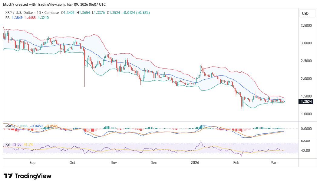 XRP trades at approximately $1.35 as of March 9, 2026, reflecting a slight 24-hour uptick but still down 7% over the past month.