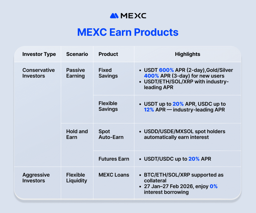 For conservative investors seeking passive earnings, MEXC Earn offers capital-protected options. Fixed Savings provides new users with exclusive 2-day USDT products at 600% APR and 3-day XAUT (Gold) and SLVON (Silver) products at 400% APR. The product also offers industry-leading APRs on USDT, ETH, SOL, and XRP for all users. In addition to the USDT upgrade, Flexible Savings offers industry-leading rates on USDC. The Spot Auto-Earn feature enables USDD, USDE, and MXSOL holders to generate passive income automatically. Additionally, Futures Earn provides users with up to 20% APR earning opportunities on USDT and USDC.