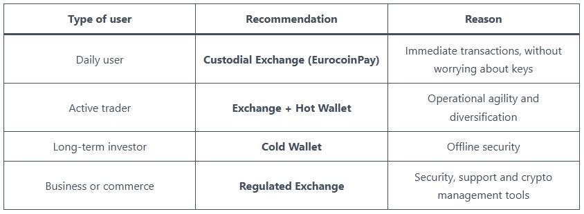 Below, we analyse the main types of cryptocurrency wallets, their advantages and disadvantages, and why an exchange such as EurocoinPay may be the most practical and secure option for most users.