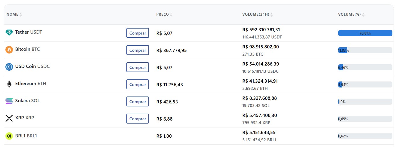 Dados do Mercado Cripto revelam que o USDT está sendo a criptomoeda mais negociada do dia em corretoras brasileiras, dominando 70,8% do volume nas últimas 24 horas.