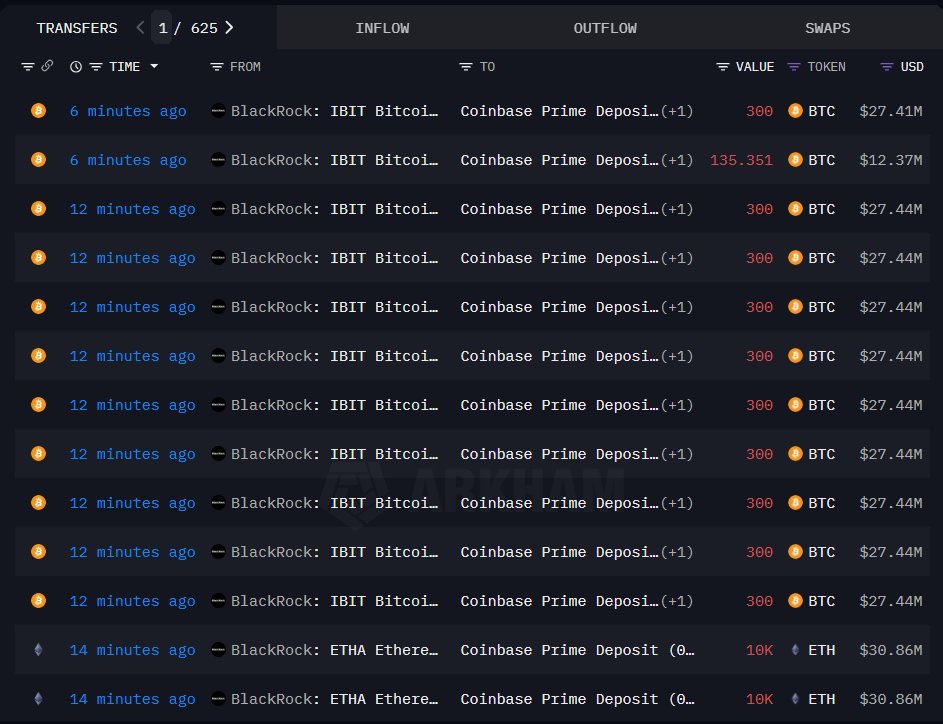 JUST IN: BlackRock deposits 6,735 $BTC, worth $616.09 million, and 64,706 $ETH, worth $199.73 million, into Coinbase - Arkham.
