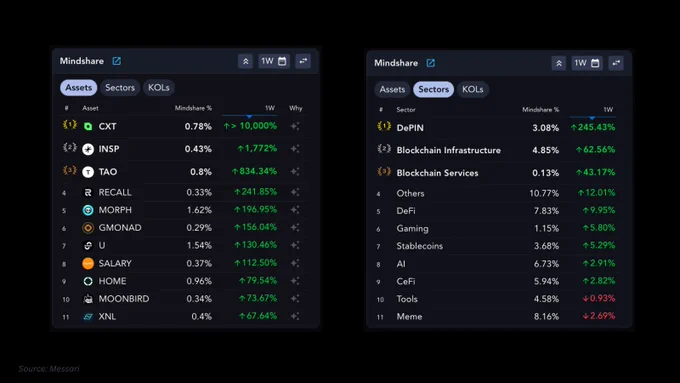 DePIN leads weekly mindshare growth. Blockchain infrastructure and services follow. Top growth movers:$CXT on $200K rewards campaign with WallChain$INSP from whale buys & listings$TAO on AI mining & Binance listing$RECALL, $MORPH, $U saw growth.$HOME, $XNL follow. https://t.co/nZXwuco9r2 pic.twitter.com/2JGcUJ8Sgm
