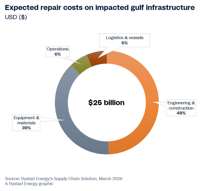 The cost to repair and restore damaged energy infrastructure in the Middle East could climb to at least $25 billion, according to initial estimates from Rystad Energy, which expects the figure to rise further based on its assessment of impacted facilities.