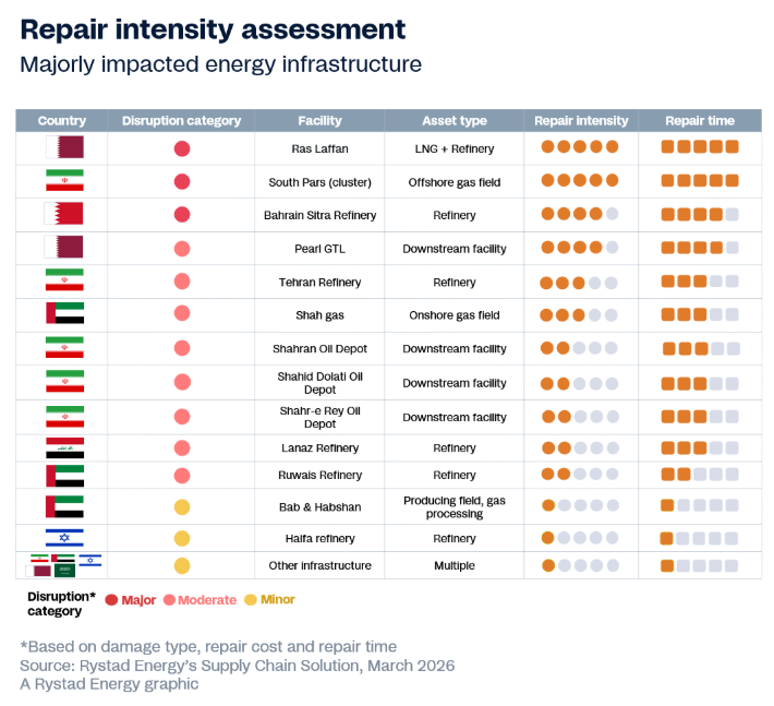 A significant exception in the analysis of repair costs and full restoration timelines by severity tier is the situation in Qatar's Ras Laffan Industrial City.