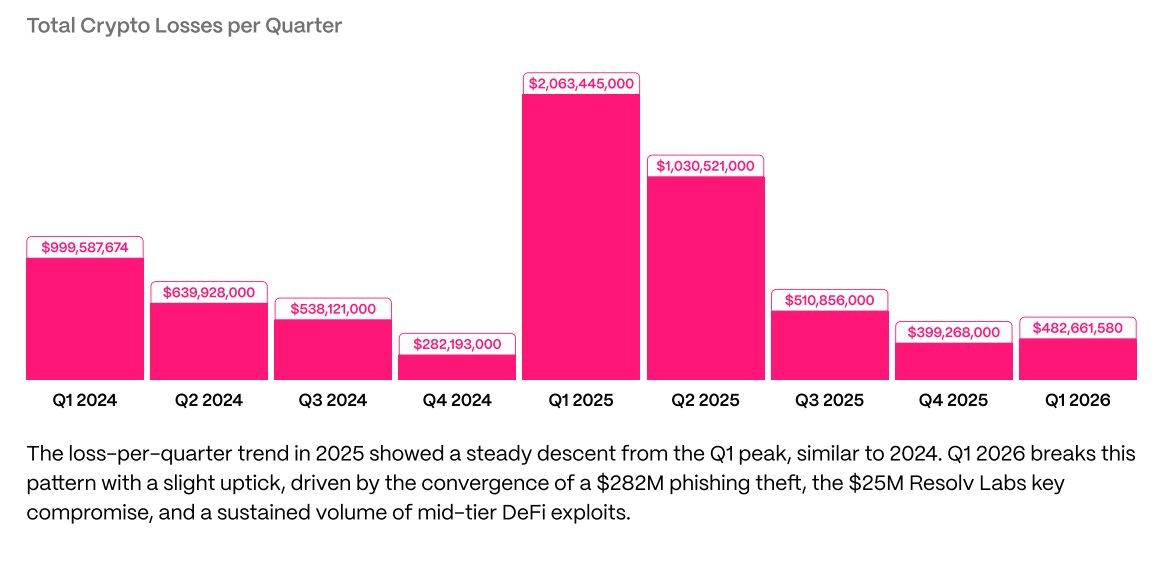 The Web3 industry lost $482 million across 44 hacks and scams in Q1 2026, marking a 20% increase compared to Q4 2025, as phishing schemes saw an alarming resurgence.