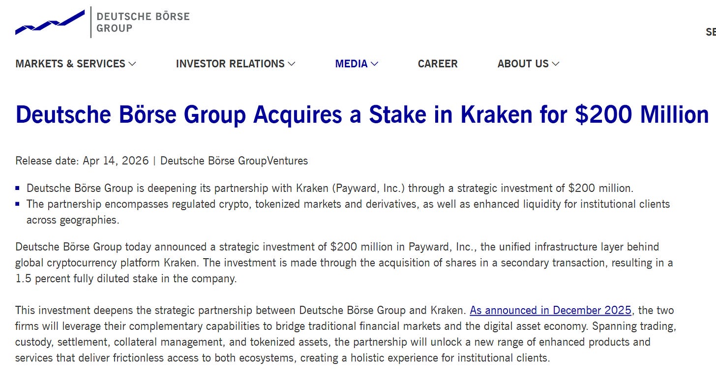 “This investment deepens the strategic partnership between Deutsche Börse Group and Kraken,” as the two firms plan to “bridge traditional financial markets and the digital asset economy” through new tokenized stock and blockchain infrastructure offerings targeting institutional clients, announced the exchange operator on April 14.