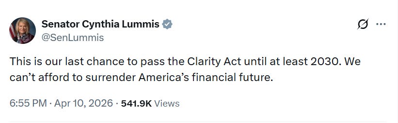 ⚖️ This is “our last chance to pass the Clarity Act,” warns US Senator Lummis