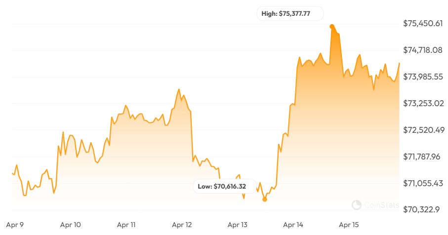 Bitcoin’s price briefly rose above the $75,000 psychological mark this week, as officials from both the US and Iran have signalled a continuation in high-level negotiations to end the ongoing conflict.