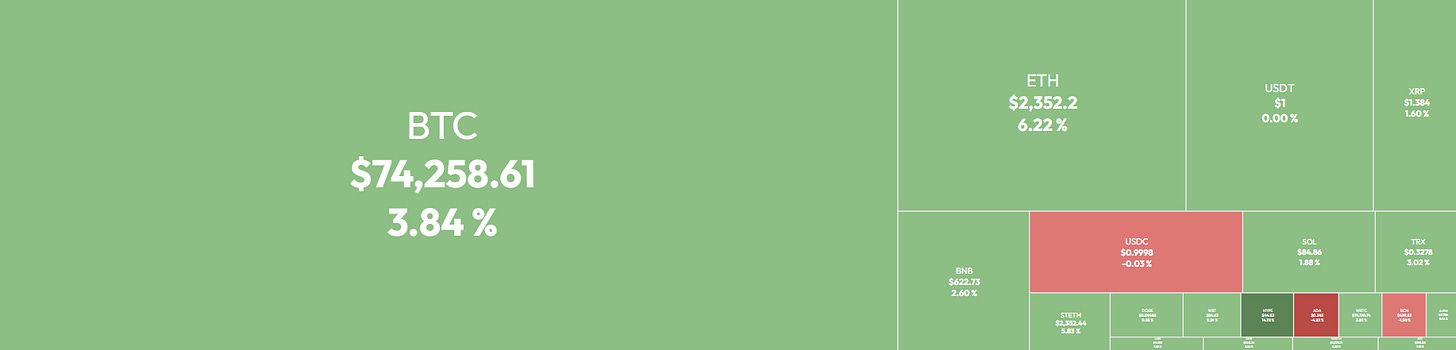 Bitcoin briefly surged to a weekly top above $75,300 before retracing to find support just above the $74,000 mark.