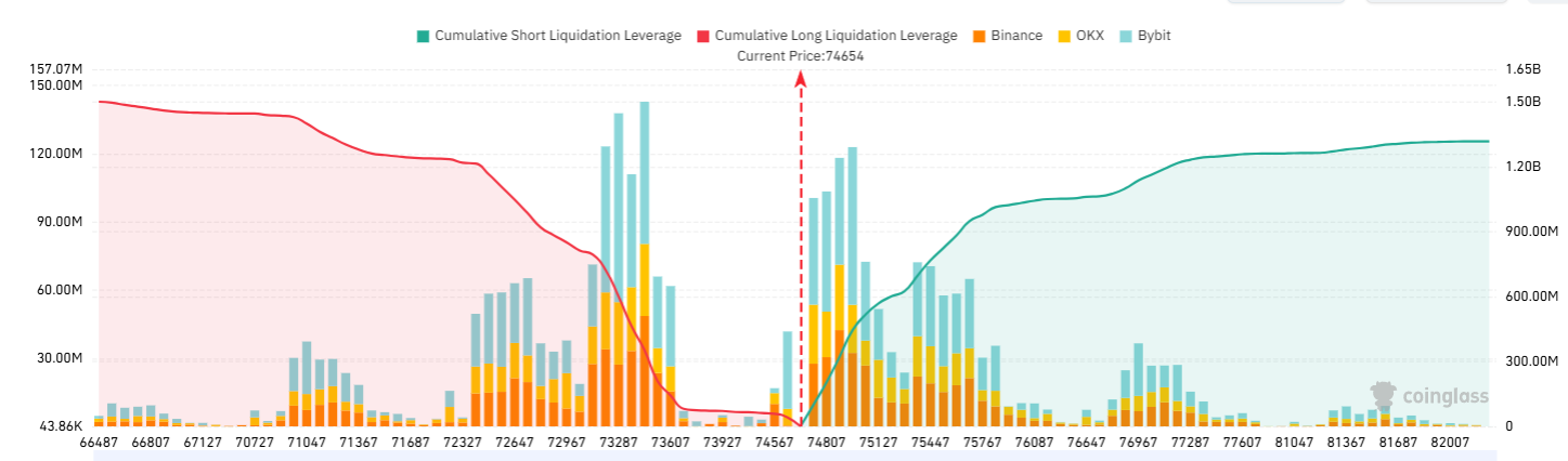 Conversely, a Bitcoin breakout could confirm if BTC price breaches the $77,300 resistance, a price level that holds $840 million worth of leveraged short liquidations, according to Coinglass.