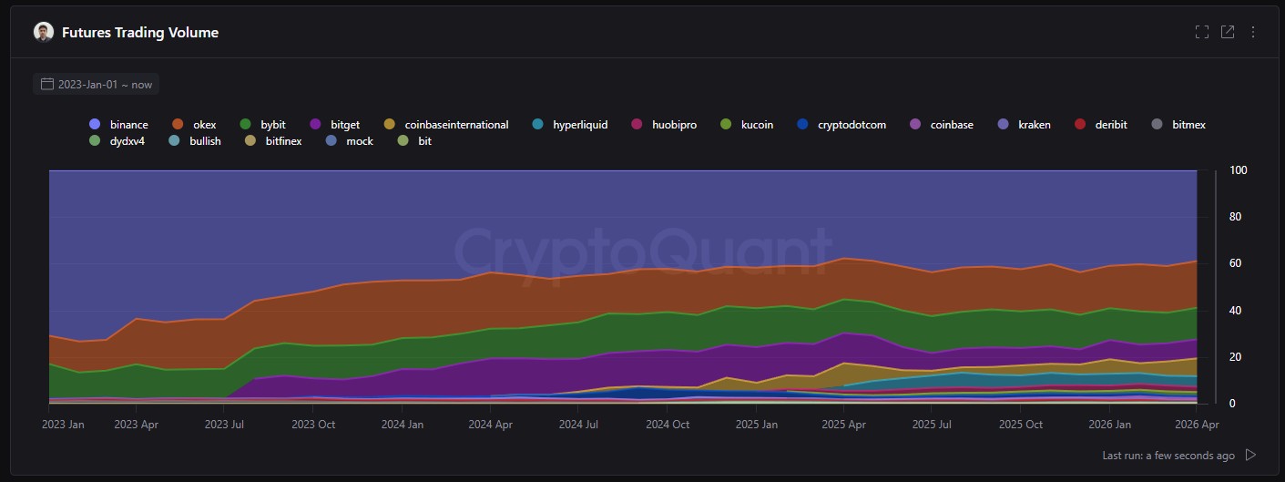 Dados publicados pela CryptoQuant nesta semana revelam que o volume de negociações de criptomoedas caiu 48% em março em relação a outubro de 2025. Embora algumas corretoras tenham ganho espaço no 1º trimestre de 2026, a Binance continua aparecendo como líder.