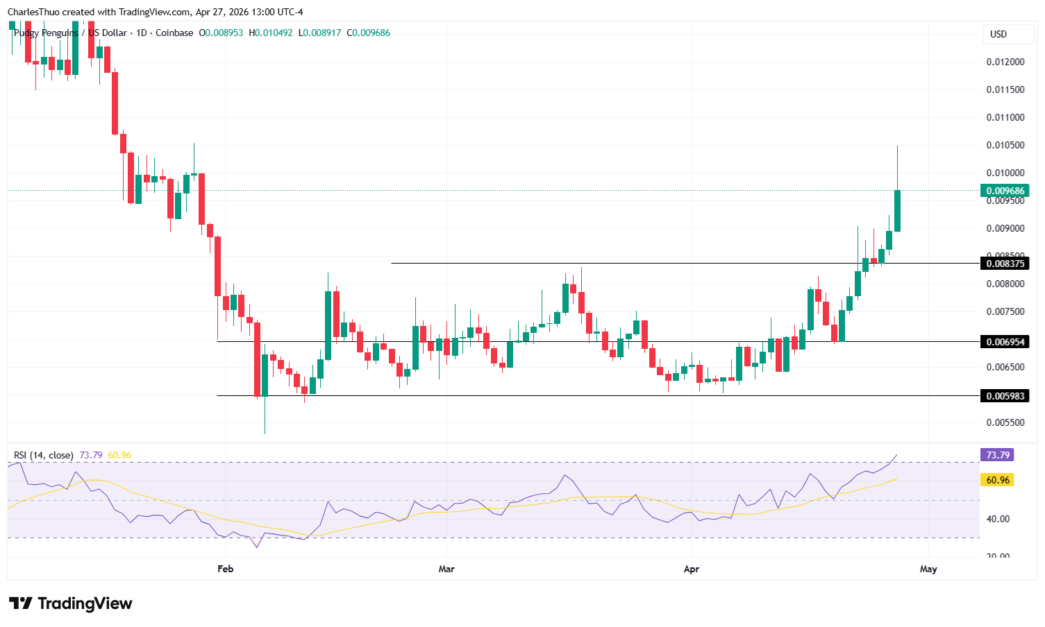 PENGU surged to a three-month high of $0.01035 before pulling back to around $0.009950 at press time, marking a 15.19% gain over the past 24 hours.