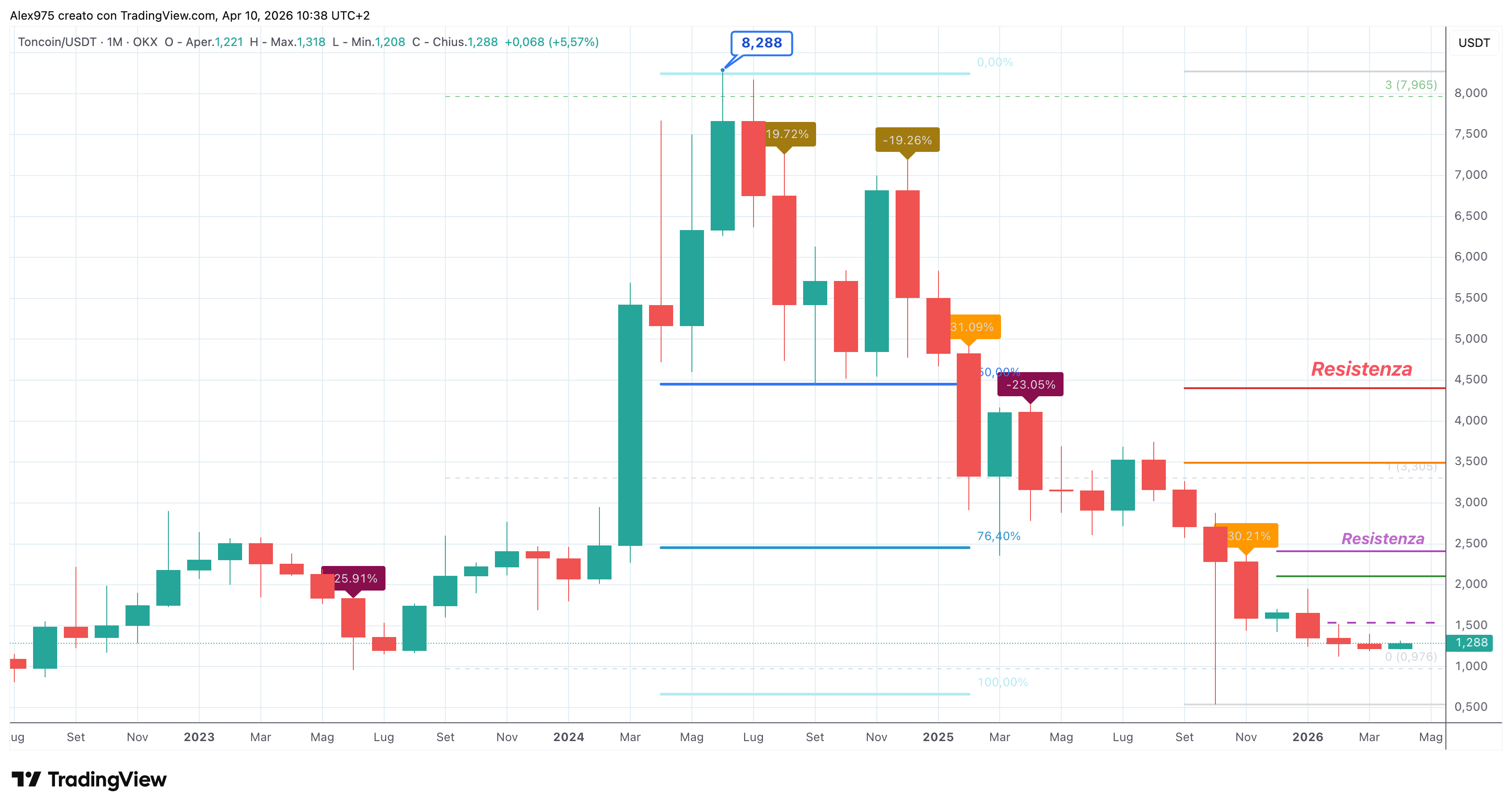 Qualcosa si muove anche su Toncoin (TON) che sicuramente è uno dei token che sta più deludendo negli ultimi due anni i suoi holder e investitori, con un forte ribasso rispetto al suo ATH registrato nel giugno del 2024 a 8,288 USDT. Attualmente TON quota 1,284 USDT e in aprile ...