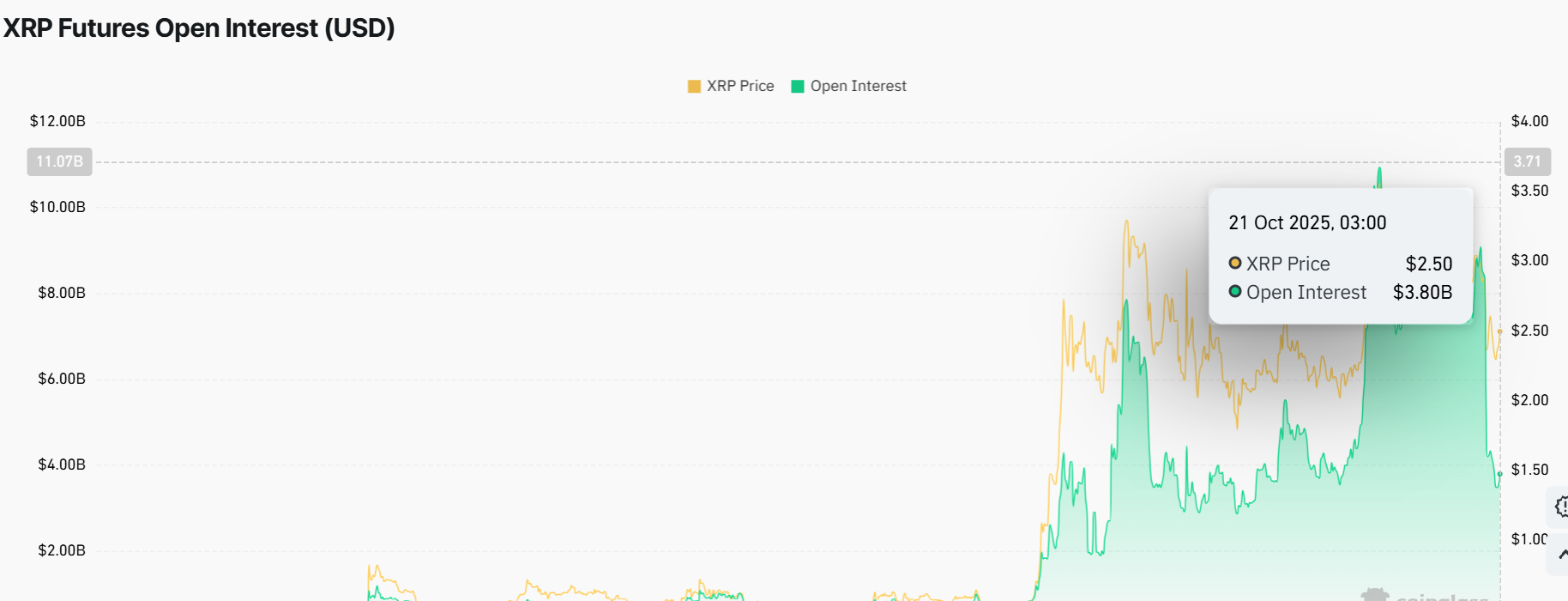 This volatility caused a second sell-off on Friday, causing investors to count their losses, with the price of XRP dropping to $2.18. The data provided by CoinGlass shows that the XRP futures Open Interest (OI) dipped to $3.80 billion on Tuesday.