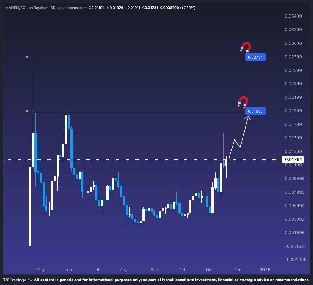 @MartiniGuyYT: Some memes are built different, $MANEKI is one of them @UnrevealedXYZ are partnered with football clubs @SheffieldUnited & @SSCNapoli ⚽️ The chart is looking bullish, pushing back up toward its former highs. I think we will regain the 0.19 level as profits start to rotate from