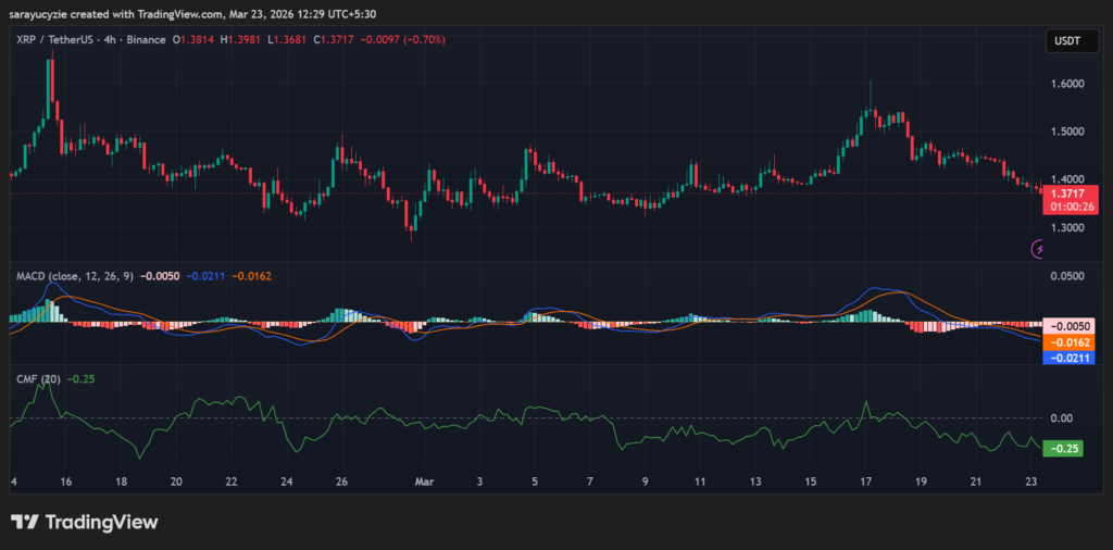 The four-hour technical chart of XRP reports that the Moving Average Convergence Divergence line and signal line are found below the zero line, which shows its clear bearish phase. The price has been trending lower, with the sellers in control, and the momentum is staying weak.