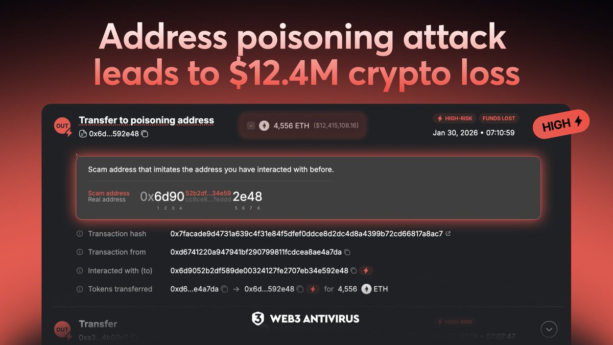 An address poisoning attack led to a $12.4M crypto loss after funds were sent to a lookalike address, per @web3_antvirus.