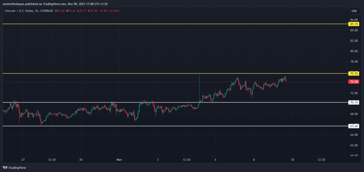 The LTC price analysis for 9 November confirms that bears are attempting to prevent an upward rally as LTC price met a surge in selling pressure near the high of $75. Over the last few hours, LTC price flashed pressure to surge above $75 but faced increasing selling demand.