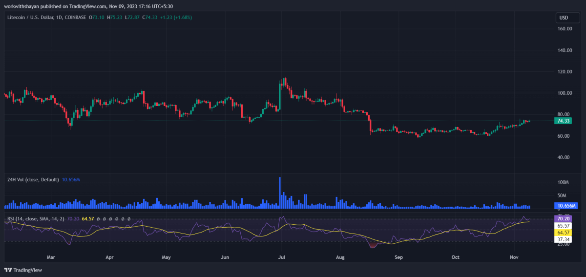 Analyzing the daily price chart, Litecoin price is currently experiencing selling activity as it failed to surge above $75, triggering a wave of bearish pressure. Over the last 24 hours, LTC price attempted to decline below $72 but bulls strongly defended an immediate decline. The 24-hour volume surged to $10.6 million, showing an increased interest in trading activity today. LTC price is currently trading at $74.3, increasing by over 1.3% in the last 24 hours.