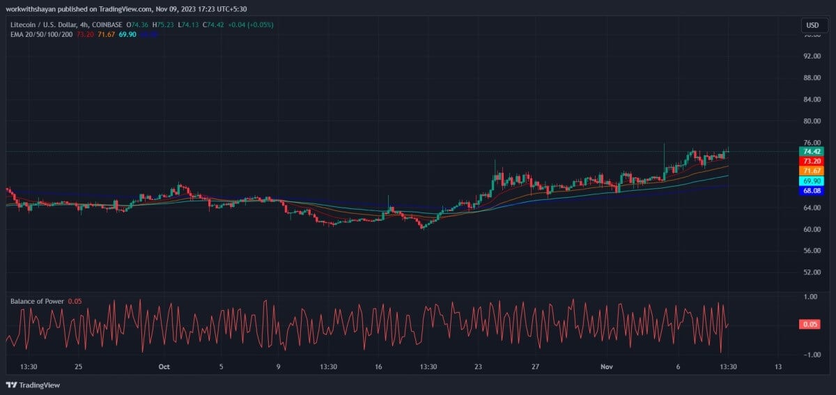 The 4-hour Litecoin price chart suggests that bears are increasing their domination to keep the altcoin below the EMA20 trend line. Currently, bears are attempting to push the price toward a downward correction below $70 to prevent a sudden surge.