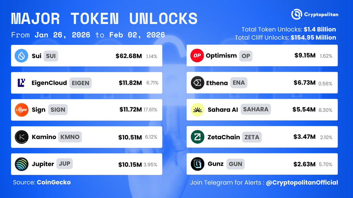 Over $1.4B worth of tokens are scheduled to unlock this week, with SUI, OP, EIGEN, JUP, and KMNO leading the list. While not all unlocks translate into immediate sell pressure, they do increase circulating supply and that matters in a risk-off… pic.twitter.com/cWEm0sZI52