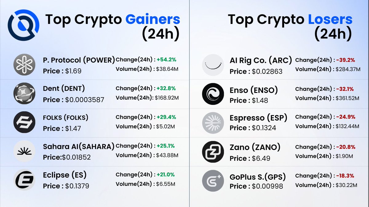 Tokens such as @PowerProtocol, Dent, FOLKS, @SaharaAI , and @EclipseFND recorded notable gains as short-term momentum rotated into infrastructure, AI, and smaller-cap altcoin narratives.