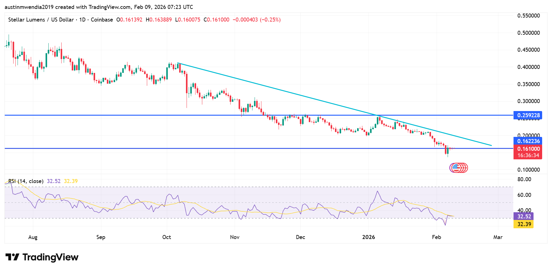 Stellar Lumens is trading at a key inflection point after an extended daily downtrend. The price is now resting near the $0.16 support zone. This area has repeatedly attracted buyers in the past. For now, bulls are attempting to stabilize the price action. However, a clear descending trendline is still capping any recovery attempts. Sellers previously defended the $0.26 region and forced sharp pullbacks.