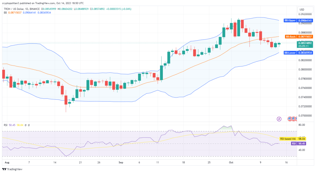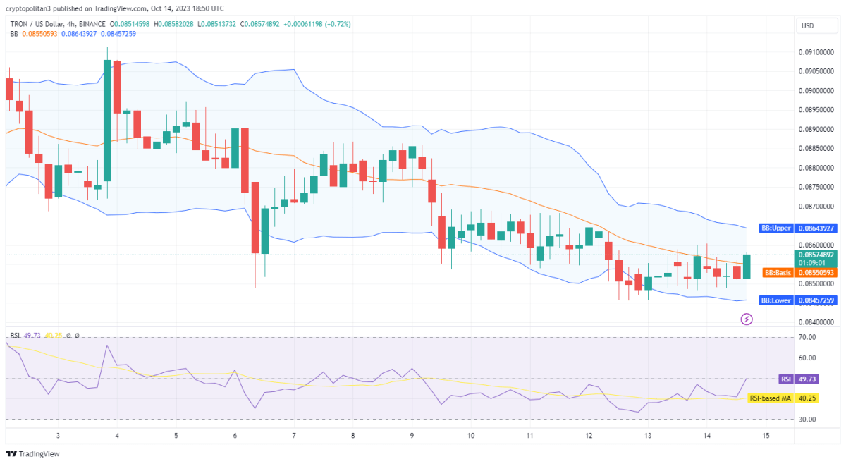 The latest one-day and four-hour Tron price analysis for 14 October 2023 shows signs of a growing bullish trend. The cryptocurrency has been exhibiting a bullish tendency since the past two days, as the buying pressure is intensifying. Although the market remained under huge bearish slump earlier, today TRX/USD value increased up to $0.0857 high. Further hike in upward momentum can be expected in the next couple of days.