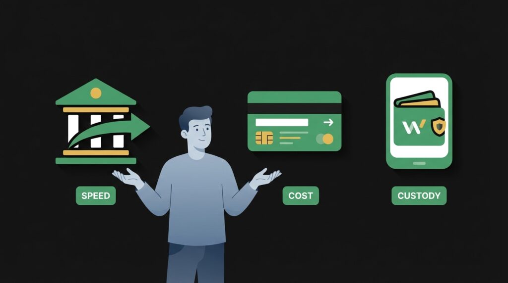 Decide your priority: cost, speed, or custody. If you need quick access, card rails work; if you want low fees, prefer bank transfer and check platform spreads.