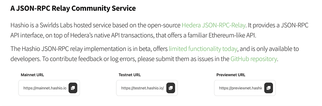 HashIO provides the URLs for each Hedera environment that will let you interact with the respective environment nodes on Hedera the same way you would an Ethereum node.