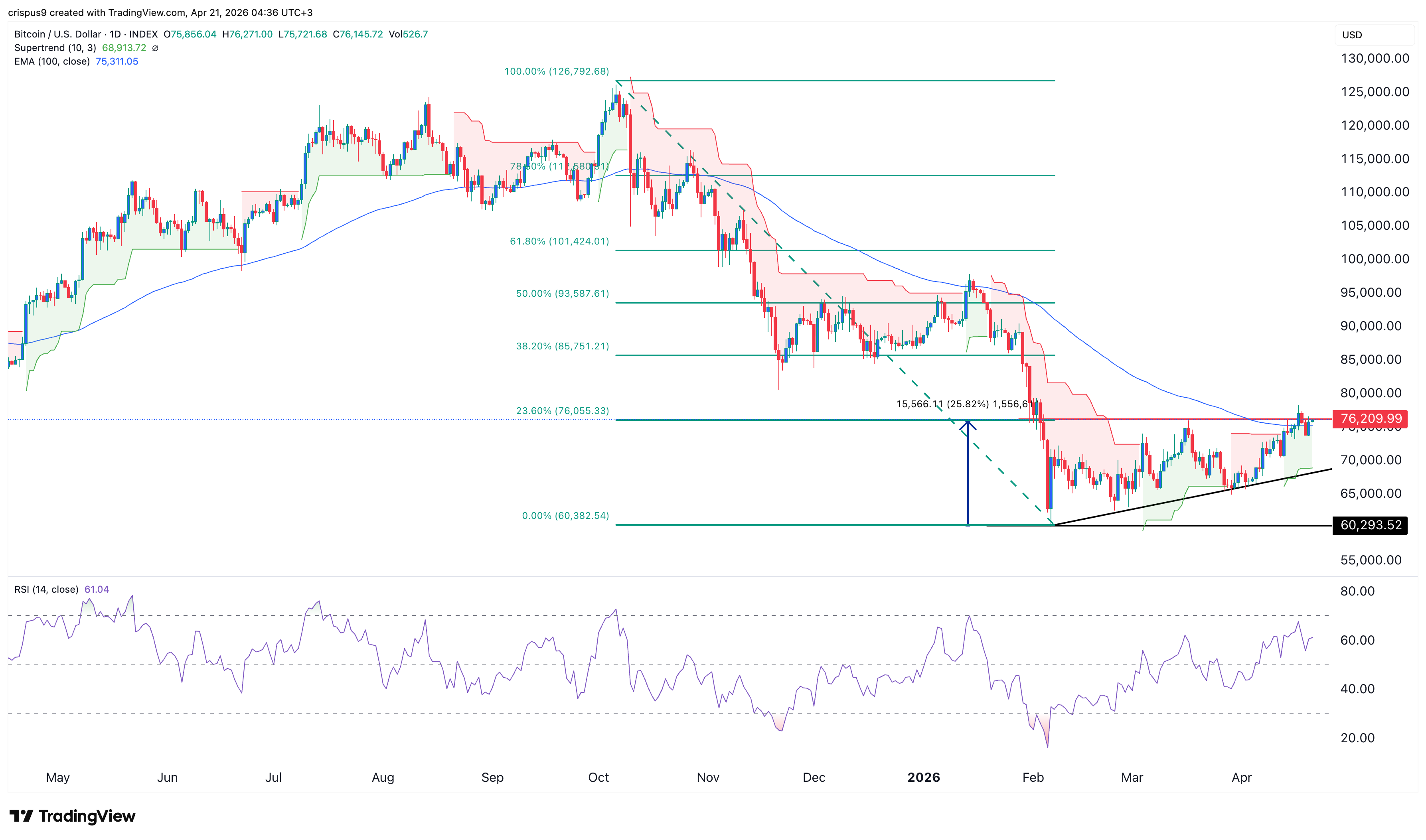 BTC and the broader crypto market is rising as Bitcoin has formed a highly bullish ascending triangle pattern. This pattern is made up of a horizontal line, which, in this case, is at $76,200, and an ascending trendline, which connects the lowest levels since February.