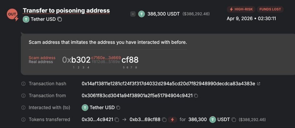 🚨 ALERT: A user lost $386,300 in $USDT after sending funds to a spoofed address from a poisoned transaction history, be careful and always double-check addresses.
